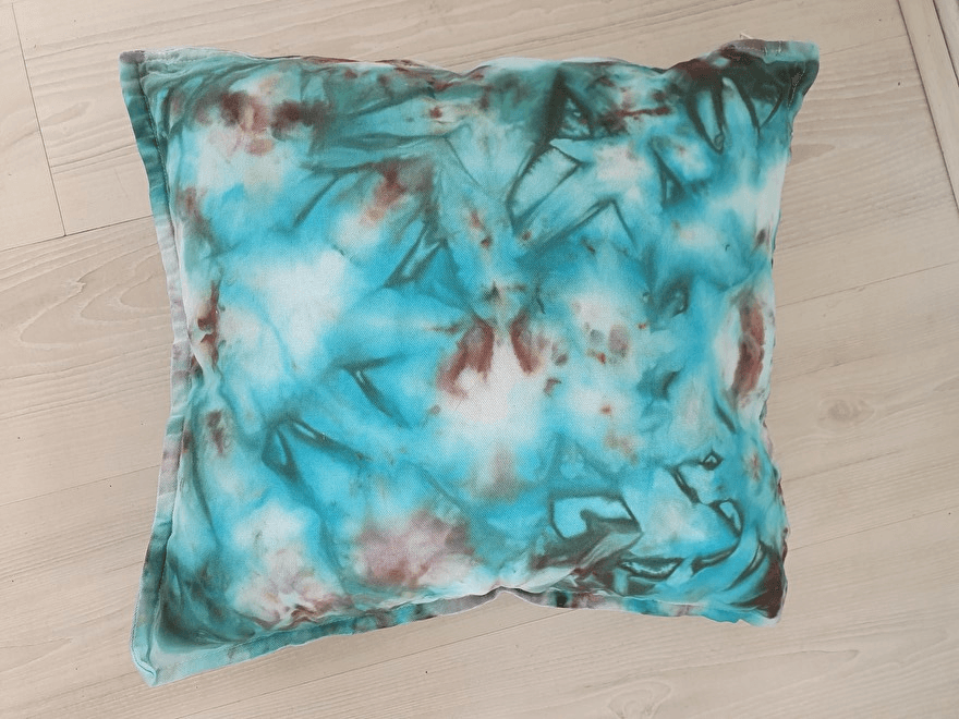 Dit kussen is gedaan met Shiitake mushroom en turquoise. Ook hier zie je andere kleuren tevoorschijn komen zoals rozerood en geel (op de foto een beetje moeilijk te zien).